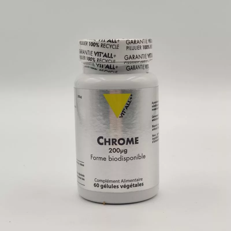 Chrome 200 µg de VIT’ALL + contient du chrome, un oligo élément essentiel à l’organisme nécessaire au métabolisme des hydrates de carbone et des lipides.